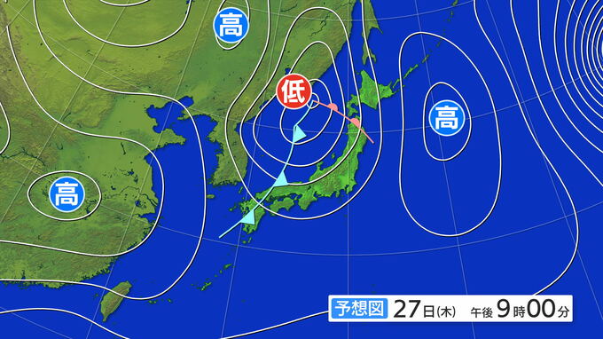 27日午後9時の予想天気図です。日本海の北東部に低気圧があり、オホーツク海に進む見込みです。