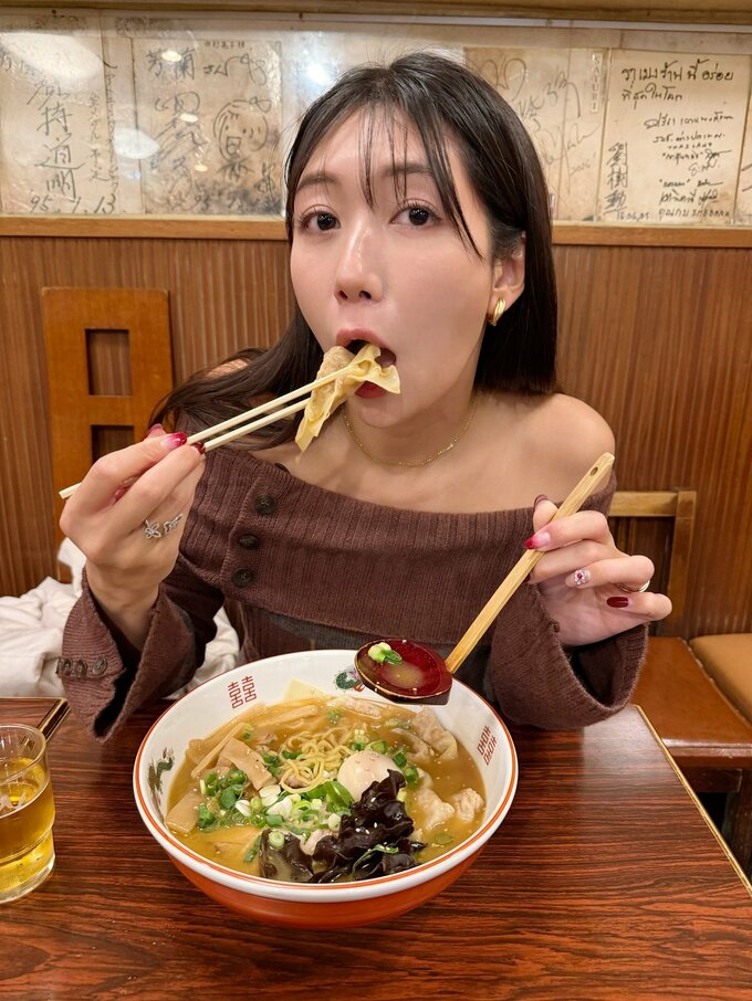 穂川さんは箸とレンゲを使い、麺をすする仕草や、カメラに向かって微笑む姿など、ラーメンを楽しむ食事風景が映し出されています。