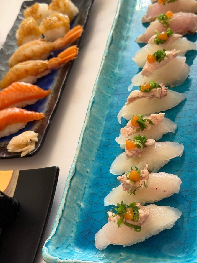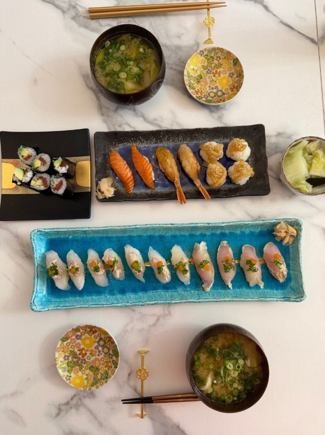 今回の寿司には、釣ったカワハギとサバフグをメインに使用。船宿で捌いてもらったフグに加え、「マグロ・サーモン・エビ・イカは買って来た物です」と明かし、マグロはアボカドと一緒に細巻きにし、イカは手毬寿司で楽しんだとのこと。