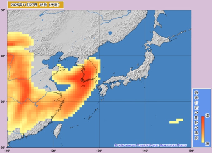 【黄砂情報】季節外れの黄砂がやってくる… しかも「高濃度」の可能性が… 27日夕方~28日朝にかけて西日本を覆うか いつ・どこに飛んでくる?【黄砂の予想シミュレーション・気象庁「黄砂解析予測図」】 青森テレビ 2025年11月27日(木) 15:05 国内 【27日(木)】気象庁の黄砂情報「黄砂解析予測図」 ※画像は気象庁HPより ♦黄砂の予想シミュレーション ♦黄砂解析予測図(27・28・29・30) ♦記事を最初から読む