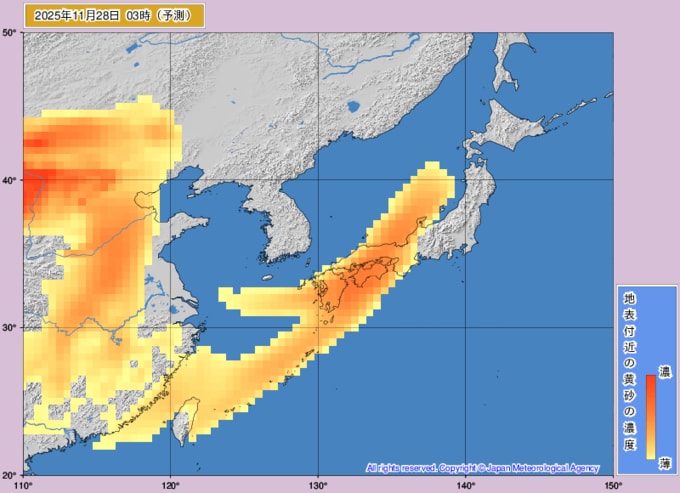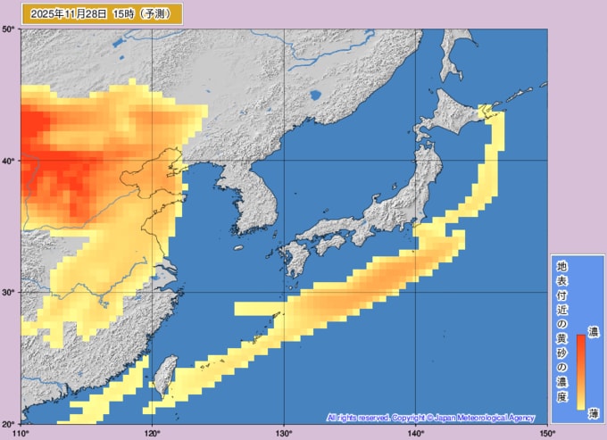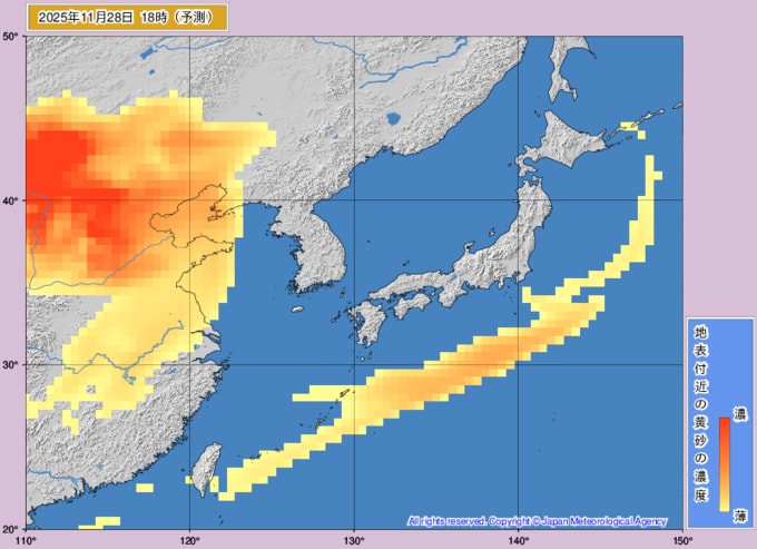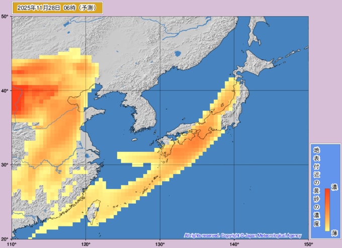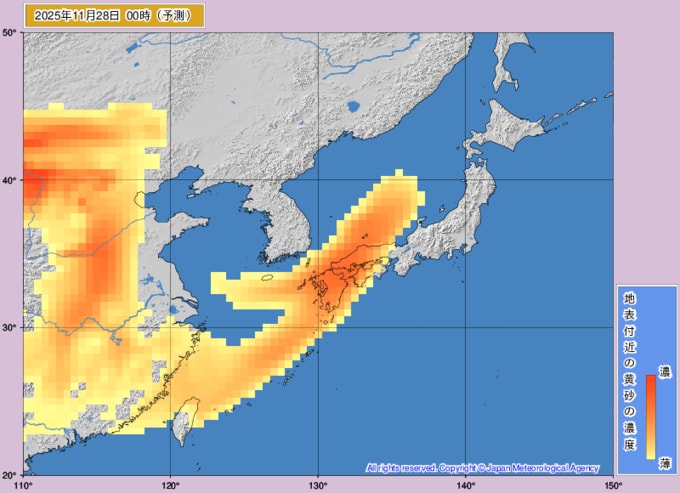 【黄砂情報】季節外れの黄砂がやってくる… しかも「高濃度」の可能性が… 27日夕方~28日朝にかけて西日本を覆うか いつ・どこに飛んでくる?【黄砂の予想シミュレーション・気象庁「黄砂解析予測図」】 青森テレビ 2025年11月27日(木) 15:05 国内 【28日(金)】気象庁の黄砂情報「黄砂解析予測図」 ※画像は気象庁HPより ♦黄砂の予想シミュレーション ♦黄砂解析予測図(27・28・29・30) ♦記事を最初から読む