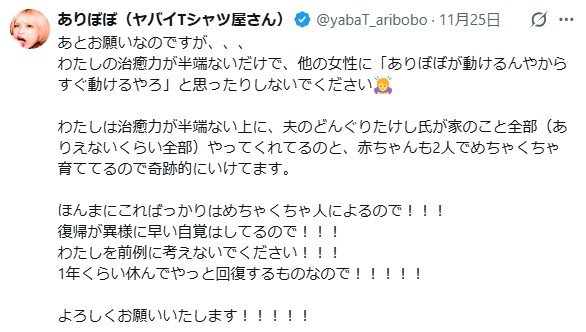 さらにリポストで「わたしの治癒力が半端ないだけで、他の女性に『ありぼぼが動けるんやからすぐ動けるやろ』と思ったりしないでください」「わたしは治癒力が半端ない上に、夫のどんぐりたけし氏が家のこと全部(ありえないくらい全部)やってくれてる」「赤ちゃんも2人でめちゃくちゃ育ててるので奇跡的にいけてます」と、自身の体力と全面的バックアップがあって初めての復帰だということを強調。