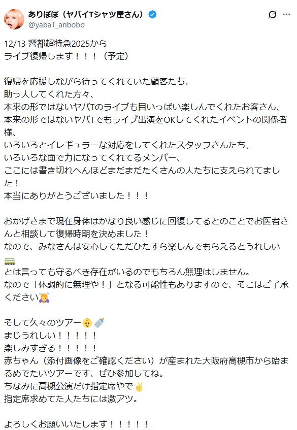 ありぼぼさんは「12/13 響都超特急2025からライブ復帰します!!!(予定)」とXで報告しました。無事に出産を迎えられたことについて、関係者や顧客(ファン)たちへの感謝を綴りつつ「おかげさまで現在身体はかなり良い感じに回復してるとのことでお医者さんと相談して復帰時期を決めました!」と、ぎゅうぎゅう詰めの文面で推移を説明しています。