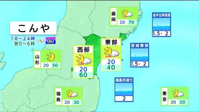 前線の影響で曇り空に変わるでしょう。夜遅くからは、大気の状態が非常に不安定となるため、急な強い雨や落雷、竜巻などの激しい突風、ひょうに注意してください。