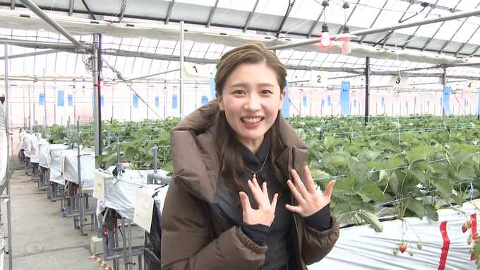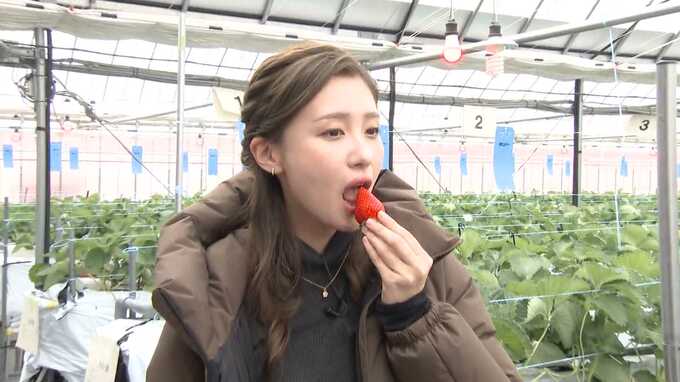 「上寺いちご園のハウスに1年ぶりに来ました。きょうも冷え込んでいるんですが1年経ってどうなっているのでしょうか…。ハウスの中は全然違う。温かいですね。そしてイチゴが真っ赤に熟しています」
