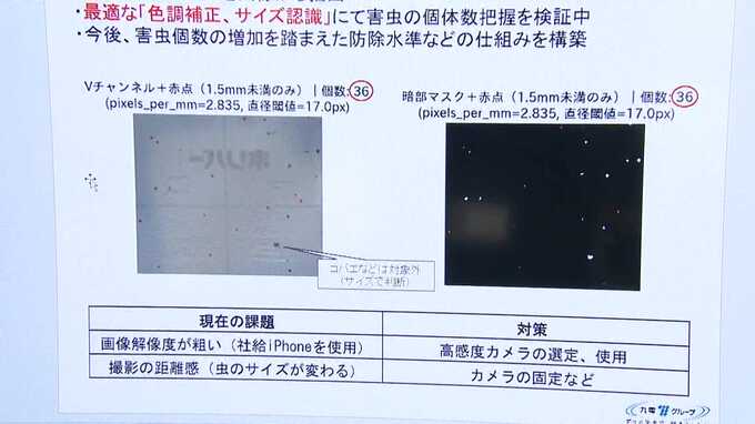 約1.5ミリの小さな害虫を人の目で確認する必要があり、発見が遅れた場合には複数回、農薬を散布するなど費用がかかります。