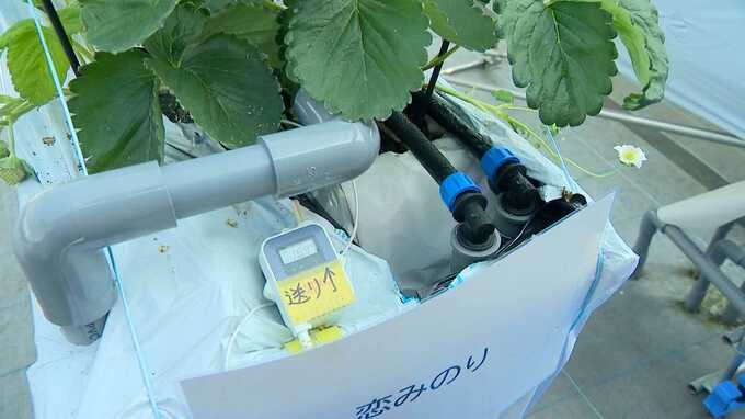 電動式ポンプを使って汲み上げた地下水を実が付く温度まで自動で調節し、株の根元に流すことで、夏場でも暑さに弱いイチゴを成長させることが出来るのです。