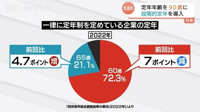 厚生労働省の「就労条件総合調査結果の概況(2022年)」によりますと、全国で一律に定年制を定めている企業のうち、定年を60歳とする企業は72.3%、65歳とする企業は21.1%と、5年前の調査より定年年齢が65歳へと移行しています。