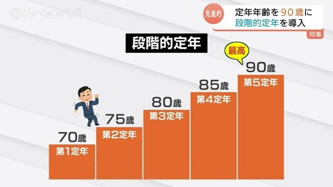 70歳を第一定年とし、健康状態や生活環境に合わせて5年おきに設定が可能。最高90歳を定年として働き続けることができるというものです。