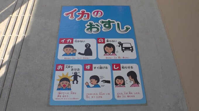 「いかのおすし」は・ついて「いか」ない・車に「の」らない・「お」おごえでさけぶ・「す」ぐ逃げる・大人に「し」らせるという知らない人への対応をまとめた防犯標語です。