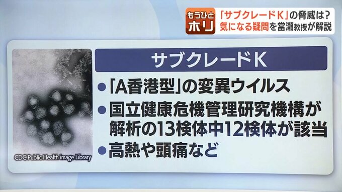 「サブクレードK」は「A香港型」が変異したもので、国立健康危機管理研究機構による患者の解析では、13検体のうち、大半の12検体がこの変異ウイルスだったということです。