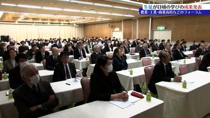 この「県産業教育フォーラム」は、県教育委員会と県産業教育振興会が毎年開いているもので、2025年は県内15の高校の生徒や教員など合わせて150人が参加しました。