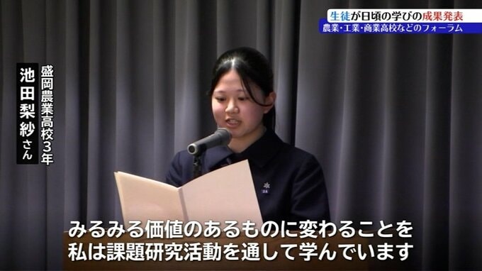 岩手県内の農業高校や、工業高校、商業高校などに通う生徒たちが日頃の学びの成果を発表するフォーラムが27日盛岡市で開かれました。