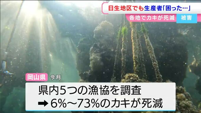 今月、岡山県が県内5つの漁協を対象に行った調査では、多いところで73%にもおよぶカキが死滅していたことが分かっています。