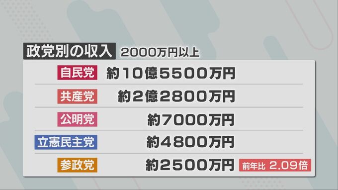 前の年から収入が大幅に増えたのは参政党で、2.09倍の約2500万円でした。