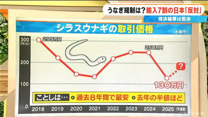 次に、「シラスウナギの取引価格」。去年は250万円ほどだったのが、ことしは半値の130万円近くまで下がっています。もし規制されていたら、この価格がまた跳ね上がる恐れがありました。そういう意味では、否決されてよかったというのが関係者の実感としてあると思います。