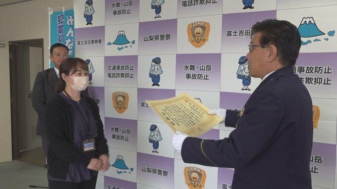 「警察から電話で金を振り込むよう言われた」1000万円の被害を未然に防ぐ 相談を受けた銀行窓口の職員が詐欺を疑い防止 To view this video please enable JavaScript, and consider upgrading to a web browser that supports HTML5 video テレビ山梨 2025年11月27日(木) 20:43 国内 電話詐欺を見抜き被害を防いだとして、金融機関と行員に警察から感謝状が贈られました。 富士吉田警察署から感謝状が贈られたのは、山梨中央銀行山中湖支店と、窓口の長谷川ちえみさんです。
