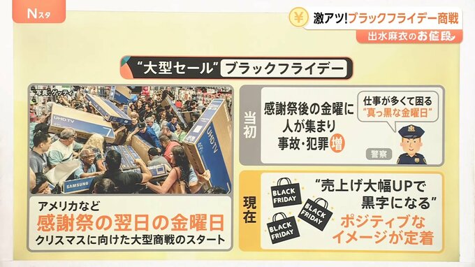 しかし1950年代、感謝祭後の金曜日に人が集まり事故や犯罪が増えてしまい、警察が「仕事が多くて困る“真っ黒な金曜日”」と形容しました。これが始まりでブラックフライデーが誕生したといわれています。