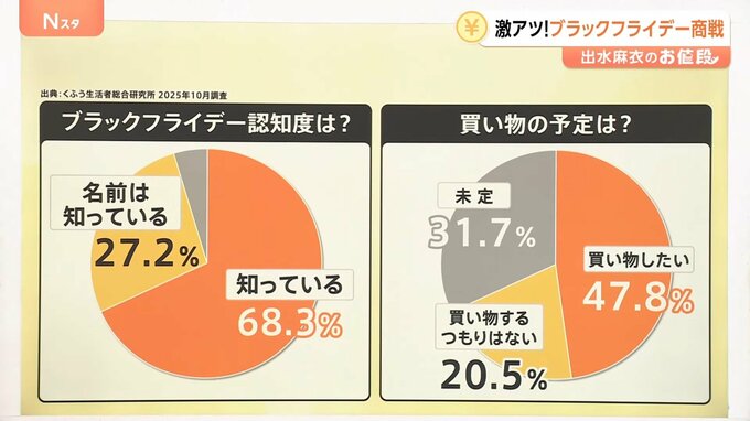 ブラックフライデーの認知度のデータをみると「知っている」が68.3%、「名前は知っている」が27.2%で、大多数の方は認知しているようです。