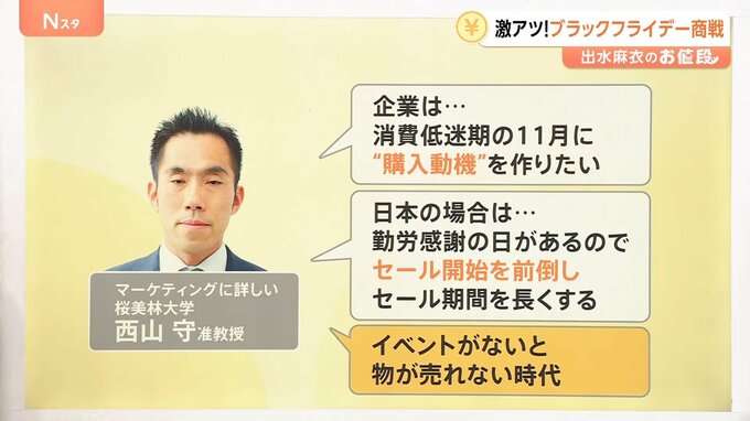 マーケティングに詳しい桜美林大学の西山守准教授は「企業は消費低迷期の11月に“購入動機”を作りたい。日本の場合は勤労感謝の日があるので、セール開始を前倒ししてセール期間を長くする。イベントがないと物が売れない時代」だとしています。