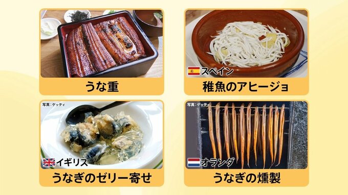 スペインでは、シラスウナギとも呼ばれるウナギの稚魚の「アヒージョ」、イギリスでは「うなぎのゼリー寄せ」、オランダでは「うなぎの燻製」として親しまれています。
