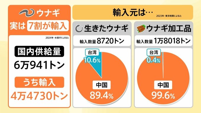 生きたウナギ、ウナギの加工品ともに、ほとんどが中国から輸入をしているということです。