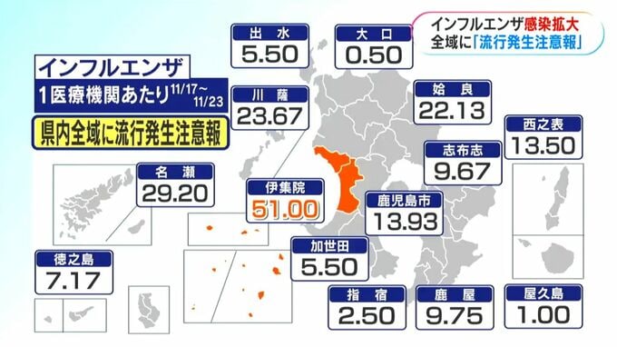 保健所別でみると、伊集院が51人と最も多く、警報基準を超えています。次いで、名瀬29.2人、川薩23.67人、姶良22.13人、鹿児島市でも13.93人となっていて、各地で増加しています。