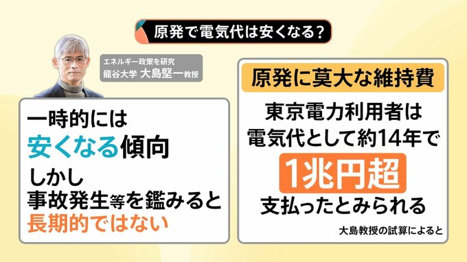 エネルギー政策を研究している龍谷大学の大島堅一教授は、「一時的には安くなる傾向。しかし、事故発生などを鑑みると長期的ではない」と指摘します。