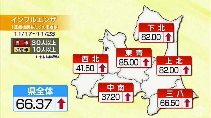 県のまとめによりますと、今月23日までの1週間に県内の指定医療機関から報告があったインフルエンザの患者は県全体で3451人で、前の週から1813人増えました。患者の増加は7週連続で、1医療機関あたりの患者数は県全体で66.37人となりました。地域別で最も多いのは、東青の85人、次いで上北と下北の82人で、続いて三八、西北、中南となっています。県は6つの地域すべてにインフルエンザ警報を発表しました。