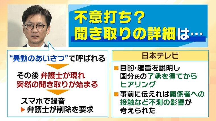 日本テレビ側の対応について河西弁護士は、あいさつという名目で呼び出してのヒアリングは「やや強引だ」としつつも「違法とまでは言えない」といいます。録音についても、「無理やり削除させた」のではなく「削除を要求した」ということから、こちらも「違法とまでは言えない」としています。