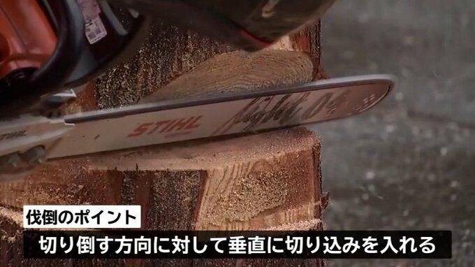 樹木を安全に切り倒すには事前に、入れる受け口と呼ばれる切り込みを切り倒す方向に対して垂直に入れることが求められます。