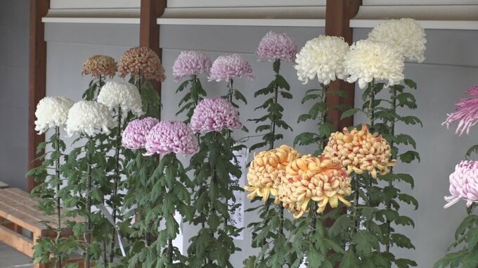 菊は全て、近くに住む古田登さんが育てたもので、中には県のコンテストで賞をとったものもあり記念館の入り口に気品を添えています。