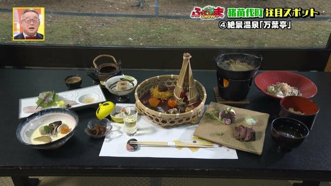 温泉だけでなく、料理も自慢の万葉亭。秋の時期には「秋の収穫と地産地消」をテーマにしたメニューが並びます。常磐もののお造りや福島牛のステーキ、猪苗代産の手打ちそばなど、全ての料理において食材からこだわっています。フランスの伝統的な煮込み料理を白みそ仕立てにした和風のフリカッセや、土瓶蒸し、きのこ鍋といったほっと温まる名物も。