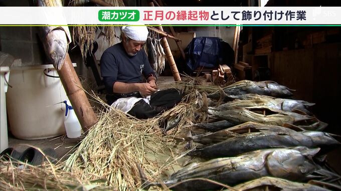 静岡県西伊豆町田子地区の冬の伝統保存食「潮カツオ」に、正月用のお飾りをつける作業が行われています。西伊豆町田子地区の伝統の保存食「潮カツオ」は「正月魚(しょうがつよ)」とも呼ばれ、その年の豊漁や子孫繁…