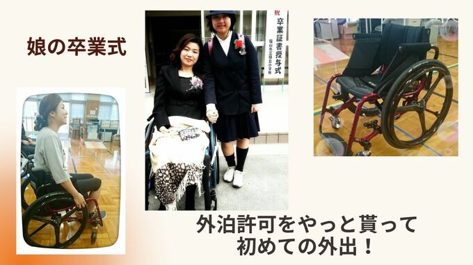 それでも様々な条件をクリアして、藤井さんは娘の卒業式に参加することに。化粧も服の着替えも自分ではできない状態でしたが、周囲の人々の助けを借りて準備し、車椅子に乗って式に臨みました。