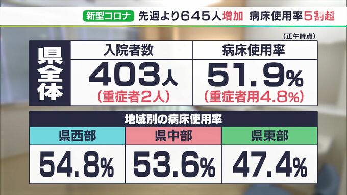 県全体の病床使用率は5割を超えていて、最も高い県西部では、54.8%と54.8%となっています。