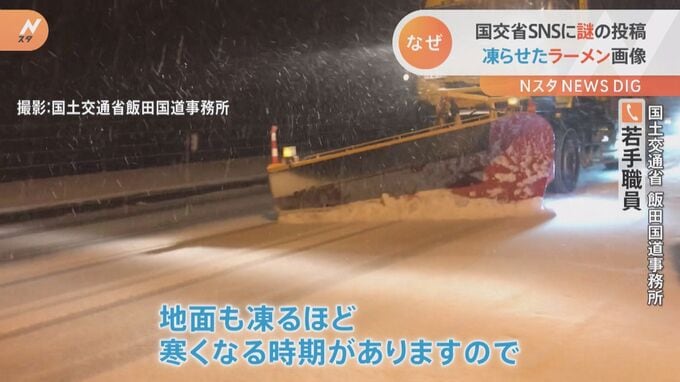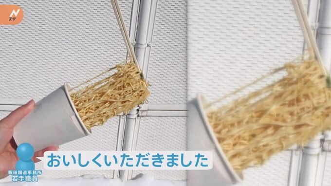 「(長野県木曽地域は)寒い地域であることを表現するためにラーメンを凍らせました。地面も凍るほど寒くなる時期がありますので、早めにスタッドレスタイヤに変えていただいたり、チェーンを携行していただく等をしていただきたい」