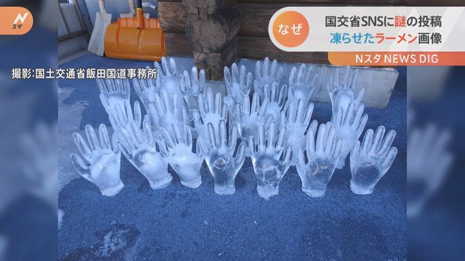 ゴム手袋に水を入れて作った大量の「氷の手」を投稿し、路面凍結への注意喚起をしていました。