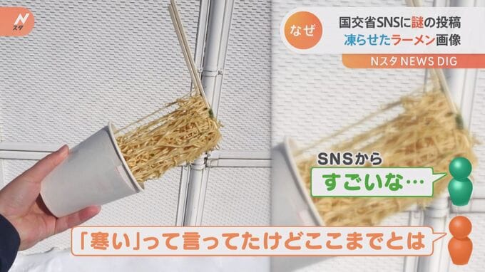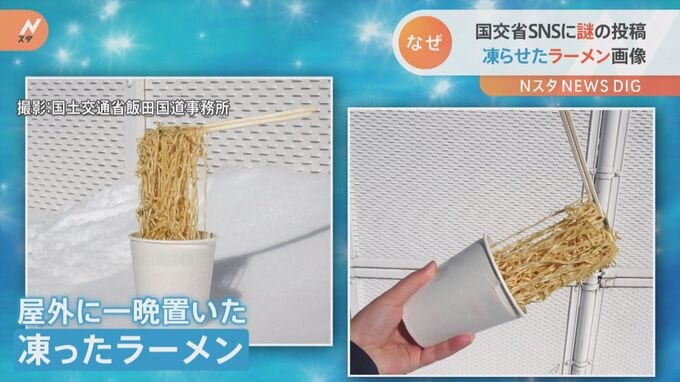 国土交通省がSNSに投稿した箸でラーメンをあげた状態固まっている画像。"食品サンプル"のように見えますが…