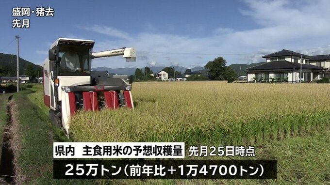 東北農政局の10月25日時点の作物統計調査によりますと、県内の主食用米の予想収穫量は25万トンで、前の年に比べて1万4700トン増える見込みとしています。