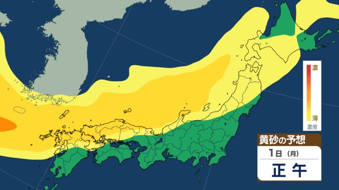 大陸方面から流れてくる“黄砂の影”は、30日~12月1日の早朝にかけて、北日本の北海道や青森にかかり続けるとみられます。その後、1日午前~夜にかけて徐々に“黄砂の影”は西日本~東日本の日本海側を中心にかかりはじめ、少しづつ太平洋側にもかかっていく見込みです。