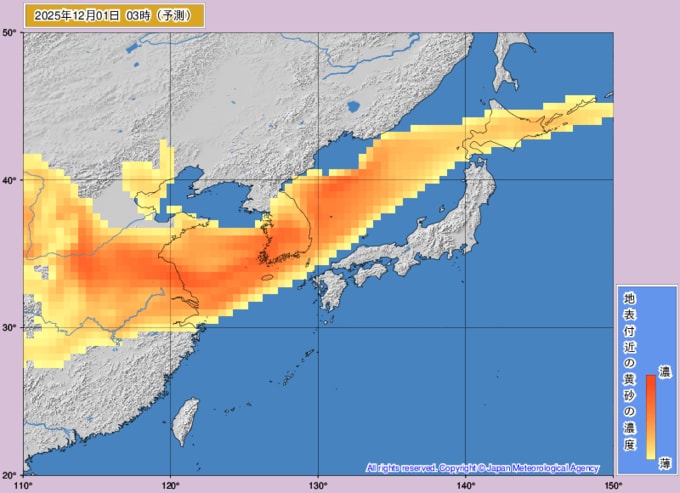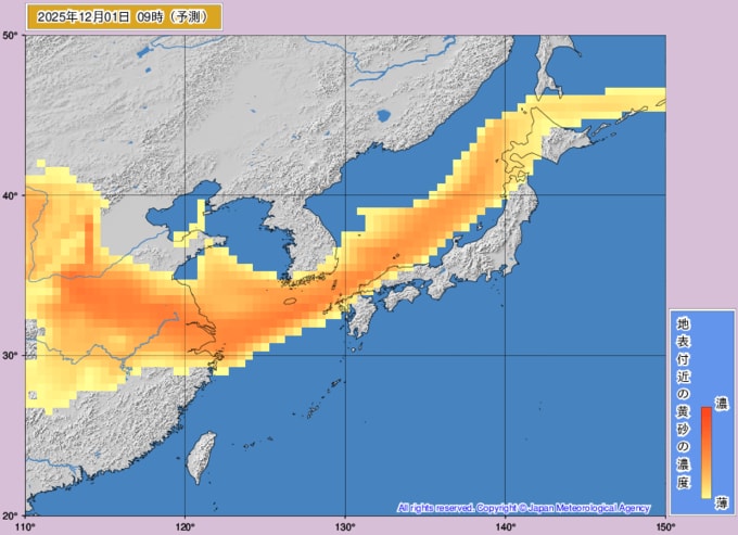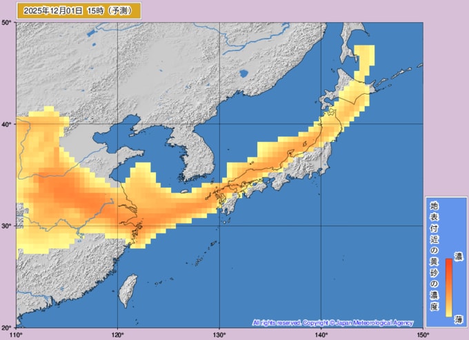 【黄砂情報】季節外れの黄砂はまだ終わらない… 来週も日本列島“真っ黄色”に 12月1日に“黄砂の影”が広い範囲を覆うか いつ・どこに飛来する?【黄砂の予想シミュレーション・気象庁の黄砂解析予測図】 青森テレビ 2025年11月28日(金) 14:45 国内 【12月1日(月)】気象庁の黄砂情報「黄砂解析予測図」 ※画像は気象庁HPより ♦黄砂の予想シミュレーション ♦黄砂解析予測図(28・29・30・12/1) ♦記事を最初から読む