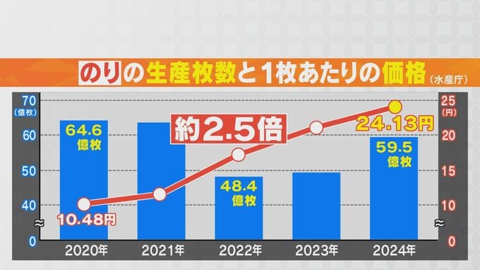 日本の海苔の生産量は、2015年~2021年は年間60億枚以上で安定。しかし、2022年と2023年は、海水温上昇の影響などで半世紀ぶりに50億枚を切りました。このため需給バランスが崩れ、価格は大幅に上昇。去年の海苔1枚あたりの価格は、5年前の2.5倍になりました。