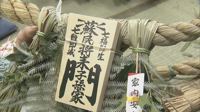 稲わらを編み込んだしめ縄に、福を招くとされる「笑門」と書かれた札や魔除けとされるヒイラギやシダ・アシビなどの葉を丁寧に取り付けていきます。
