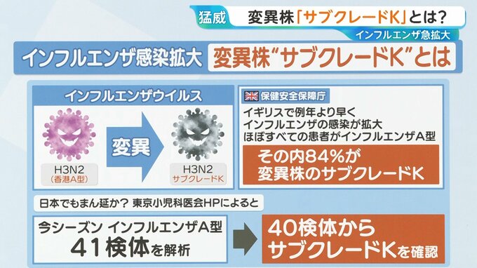イギリスの保健安全保障庁は、イギリスでは例年より早くインフルエンザの感染が拡大しており、ほぼすべての患者がインフルエンザA型で、そのうち84%が変異株の「サブクレードK」であると発表しています。