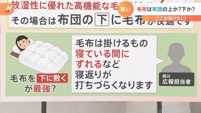 担当者の方によりますと、「毛布は掛けるもので、下に敷いてしまうと寝ている間にズレるなど、寝返りが打ちづらくなります」ということです。今は敷きパッドなどもありますので、そういったものを使ってみるのもいいんじゃないか、ということでした。