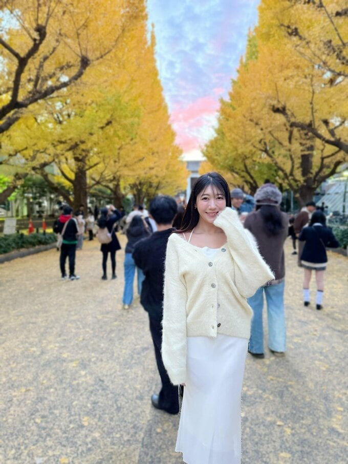 穂川さんは白のワンピースに、白いファーのカーディガンを羽織ったコーディネートを披露。色づく銀杏並木を背景に、爽やかな笑顔を見せています。