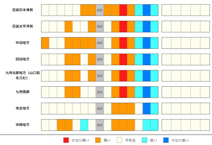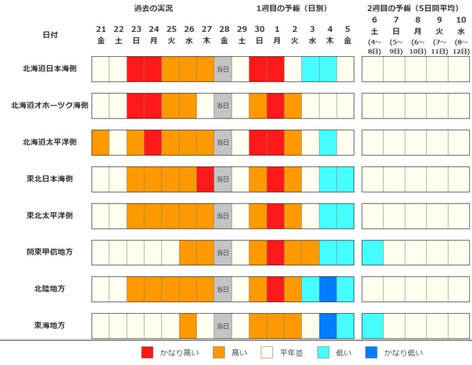 ・2週目の予報は中心の日に前後2日間を加えた5日間の平均(平均気温の5日間平均)です。平均期間は中心の日の下に表示しています。2週目のかなり高い(かなり低い)は、かなり高い(かなり低い)気温となる確率が30%以上のときに表示します。