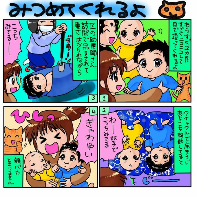 翔子さんは、インスタグラムに絵日記を投稿。「みつめてくれるよ」と題した4コママンガによると、「もうすぐ2ヵ月 すごくニコニコして目で追ってくれるよ」とのこと。掃除をしていても「わー双子でこっちみてる」と、翔子さんをじっと見上げる双子に驚いている様子です。また、区の助産師さんが訪問した際も「吊るされて重さはかられながら」「こっちみてるー」と描いていて、順調に成長している様子を伝えています。