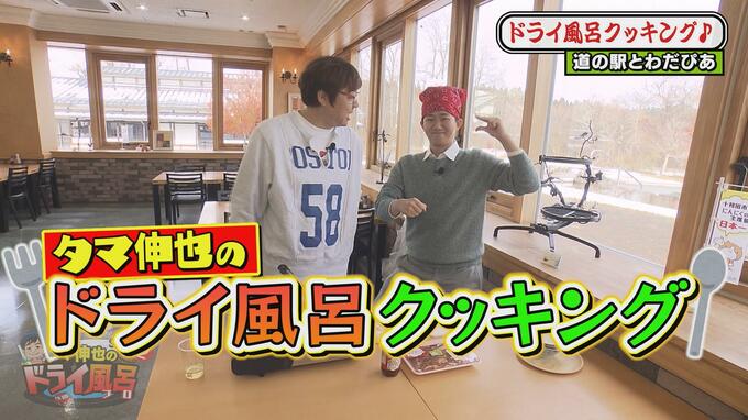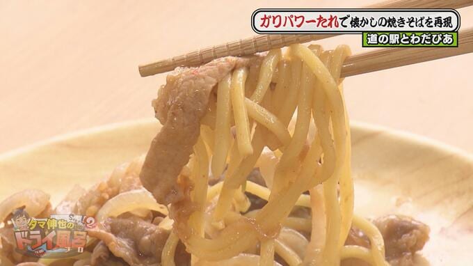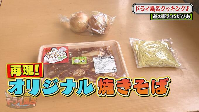 せっかっくなので、このタレを使って懐かしの焼きそばの味を再現することに。同館のレストランをお借りして、『タマ伸也のドライ風呂クッキング』スタート。ご当地のブランド肉『十和田ガーリックポーク』を使い オリジナル焼きそばを作ります。